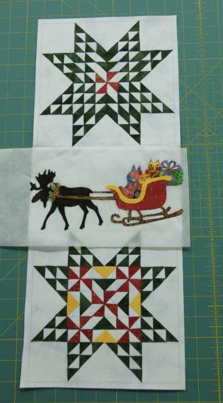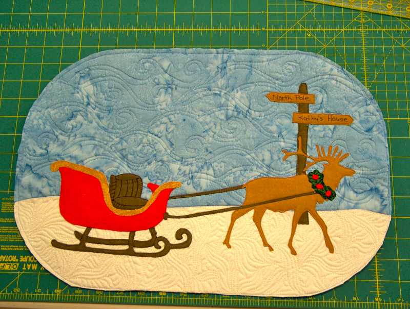 I make a placemat gift card holder for a gift card for a quilting friend named Kathy. I had an elk pulling a sleigh and I put the gift card in the sleigh.