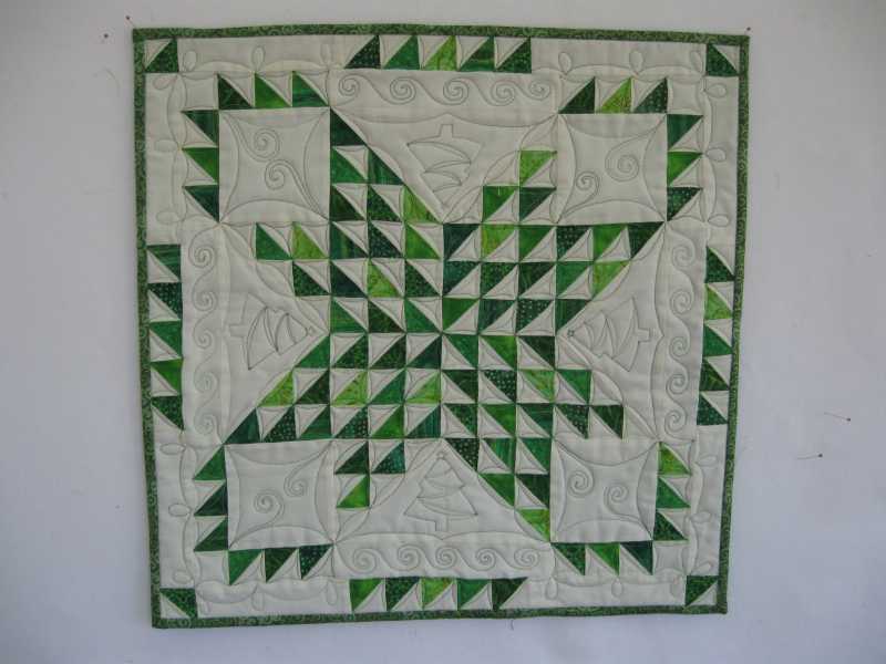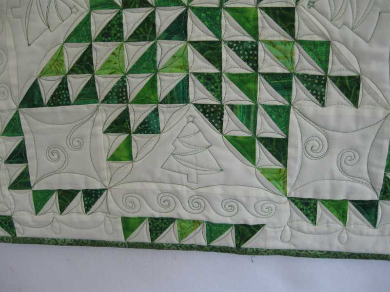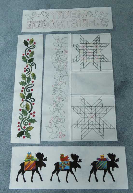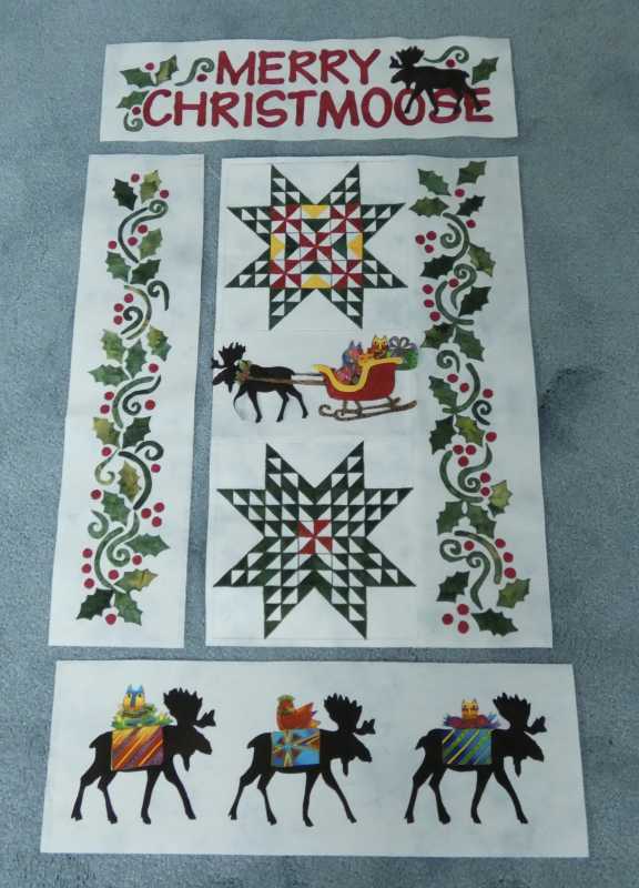 using my HP printer. I put fusible on the back of a square of fabric, and then cut the freezer paper triangles. I used a single square of white batik as the white, so I did not have to cut any white pieces. After fusing all in place, I edge stitched with a double straight stitch along each colored triangle. I try to do as much edge stitching as I can before assembling the blocks. I did 1.0 1.0 zig zag to edge stitch the lettering and border holly leaves. I did a blanket stitch on the top moose. So far things are going well. HelenW