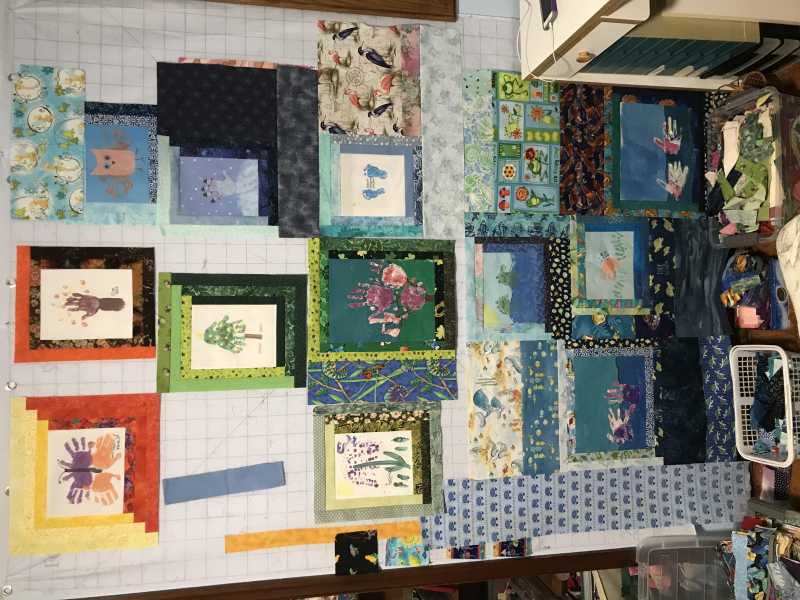 Working on the back of a quilt for my husband. The front is a large turtle, the back is a combo of blocks that are made from several of our grandkids. Took me a long time to figure out what to do with them.