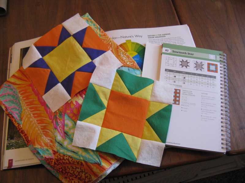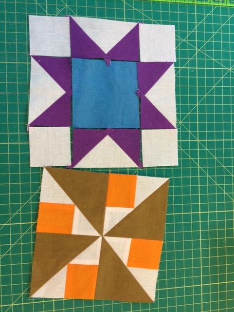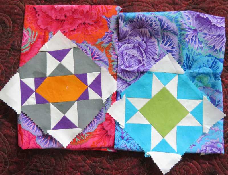 So I decided to do what many of you have been doing, and put each block with a Kaffe fabric from the set I got in the mail. A couple of the blocks I had to stretch my imagination to make them go with one of the fabrics. Shaking my head. But I made it work, and I like what's going on with them. So I picked a couple of Kaffe fabrics that didn't have anything with them yet for both Fridays and todays blocks Whirlwind and Sawtooth Star. My color wheel hasn't arrived yet, so I can't tell you how they fit on the color wheel. I just know they go with the Kaffe. (Sorry I didn't photograph them with the Kaffe fabrics.) Next time I will try to remember do so. I also want to say what Donna2018 said and add my hip hip hooray for Alex and the mystery quilt. I haven't got the Sawtooth completed yet, ran out of time today... but I love love love the method for the flying geese. I think these are the best one's I've ever done.