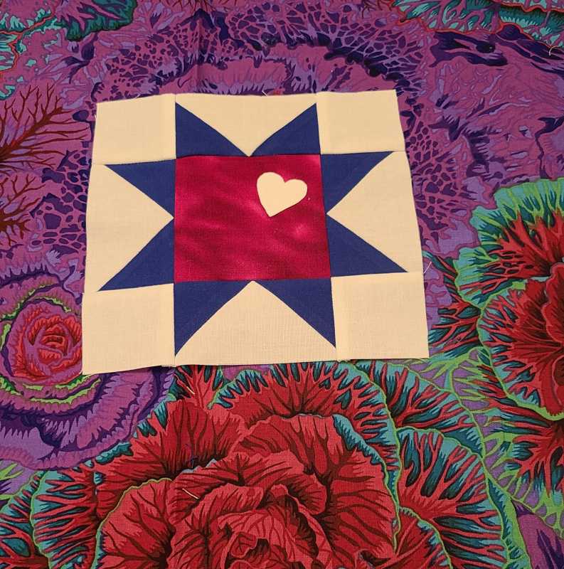 I finished #7 today. I included a block yesterday and thought it was #7, pinwheel. Oh well, I'm going to redesign it to add in later on. I planned to make a patriotic block that goes with the Kaffe fabric. It took me a while to go through my stash. Just any red wouldn't work. It had to be a deep raspberry red. The little heart is fused on, hoping to put a small embroidered edge on it.