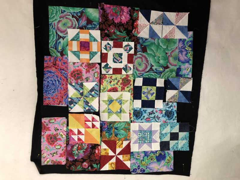 Just a thought to play with, (maybe), but in another post, someone talked about the whites being too light and changing some of the blocks because of it. I would like to suggest another option to try out and that would be to put your white Kaffe in the center with the blocks just as they are, then surround them with the darker colors rotating around that center . That will now make the light your focal point much llike a center square Amish quilt or the Trip Around the World design. Not sure if that fits in with your original concept, but just what came to me based on what I had read previously. You might want to just forget those very white ones for this project if you want a totally blended feel. I don't know how to make white blend in in a much darker quilt. But it looks great to me!