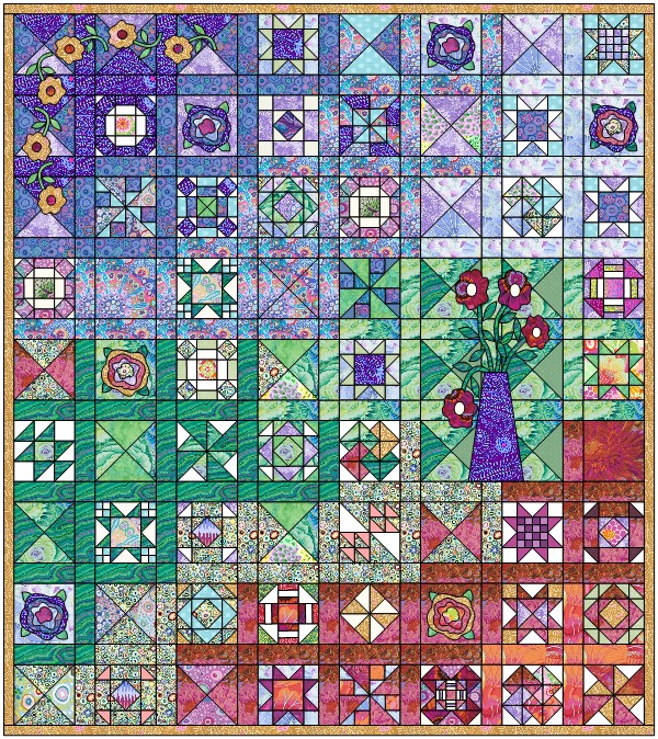 Well this is what i gave done so far to catch up. I just got my fabric this last Monday. You won't see the Single Wedding Ring block in here cause I'm having trouble with it. I have checked, double checked, and yes triple plus checked my cutting sizes and they