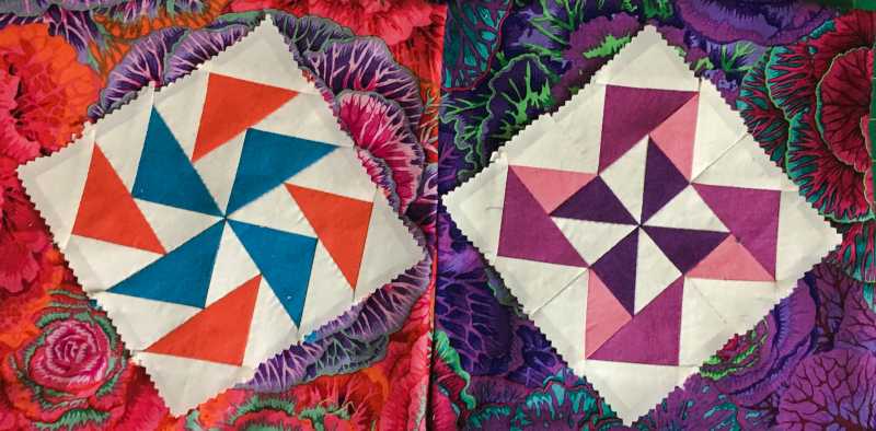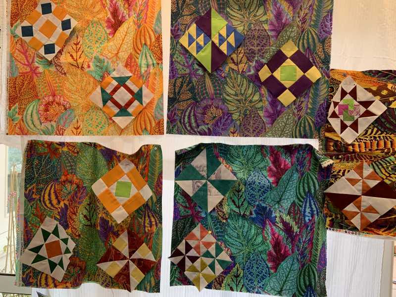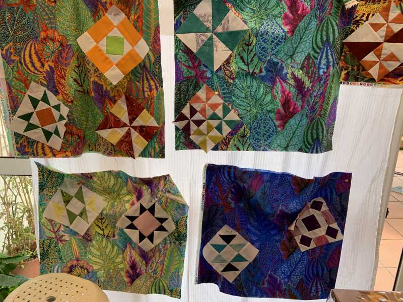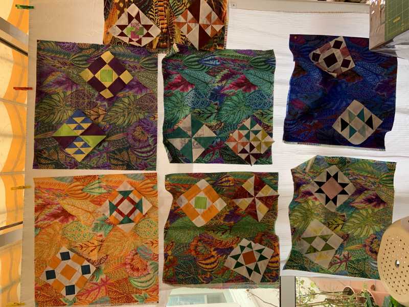 Several of the Brassica fabrics had the colors aqua green and fuchsia in them, but the solids in the kit didn't include these colors. I really wanted to include these colors. I discovered I had some Setacolor fabric paint that had these two colors. So I painted small pieces of white fabric with these two colors to use in my blocks. You can see this painted fabric in the first picture of the Single Wedding Ring and Sawtooth Star Variation.