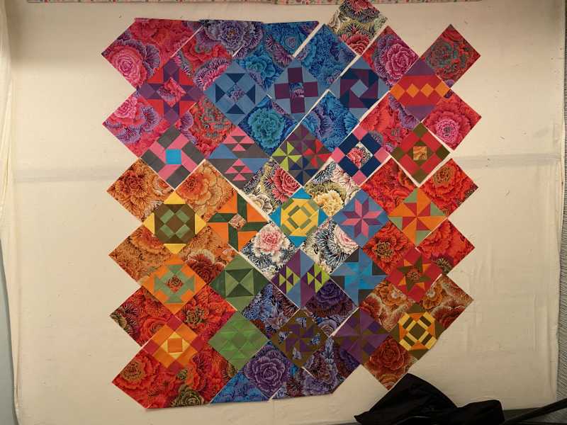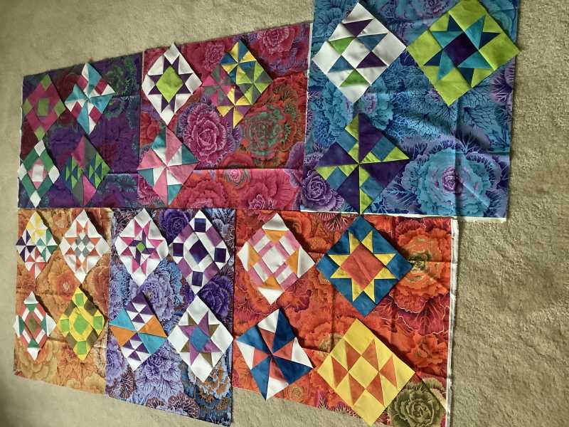 I have decided to put my blocks on point and to keep the Brassica fabric intact as a whole square as I love it! On the triangles around the blocks I have decided to use some pastel Batik from my stash, trying to pick up the colors from the Brassica. Then I will construct a small border using the left over solids; still working on that design and will post it when the sewing of the blocks is complete. I loved working with the Brassica colors and the color wheel! It has taught me a lot about color. I am new to sewing these types of blocks and it has forced me to really be careful in my cutting and sewing. Thank you! All skills that I need to work on.
