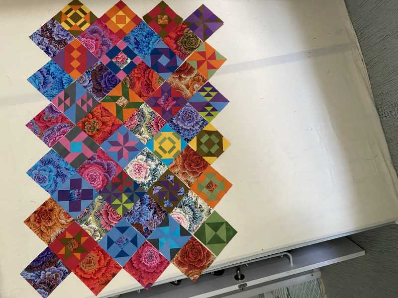 I always line up by color according to color wheel (YORPBG) with tertiaries and pastels (pink, lavender, aqua) in between before mixing them in the quilt. My next step is to mix the blocks with the Kaffe print corners.). THEN stand back and look through your camera lens. Which color jumps out to you?