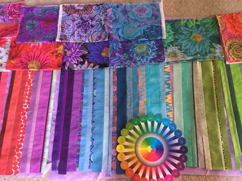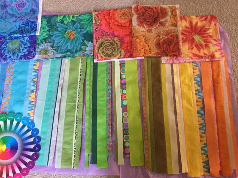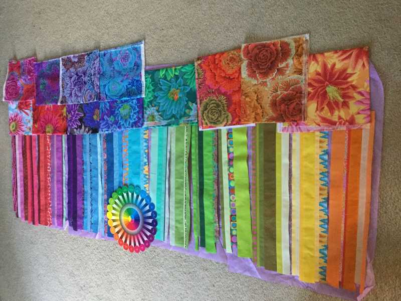 I’m just getting started — I had a fpp mini swap to finish, which was way fun. I watched Kaffe Fassett in his video about Burano and was inspired by his strip snowball quilt. So I’ve taken my hand dyes and combined them with other solids and a lil Kaffe, resulting in strip sets I’m going to use as solids in the color wheel. The strip sets are done and I’m ready to start my blocks! This is so awesome and such a great learning experience. I feel pretty privileged to have all these instructional by Alex.