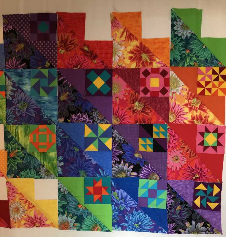 Here are my blocks so far. In keeping with current Stage 4 lockdown restrictions I am using my stash from home and don’t have any Kaffe except a few stripes. I thought my collection of Aboriginal Prints offered a nice variety of colours to work with and the whites seem to play well with them too. It’s been nice to slow down and take the time to consider how the colours for each block design works or doesn’t and be more precise with the actual block construction. I am really interested in seeing everyone’s ideas on how to layout the final quilt.