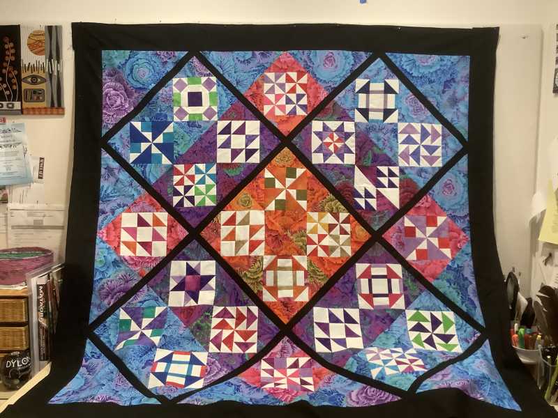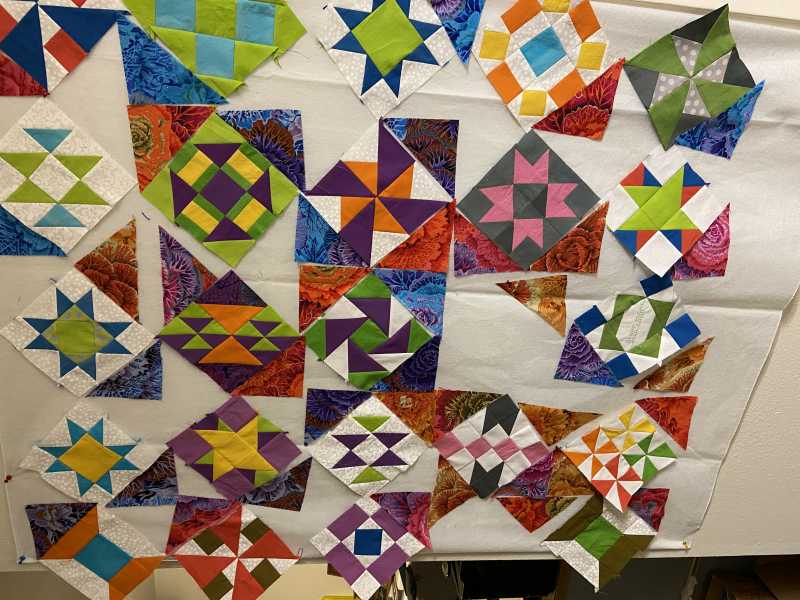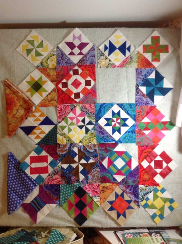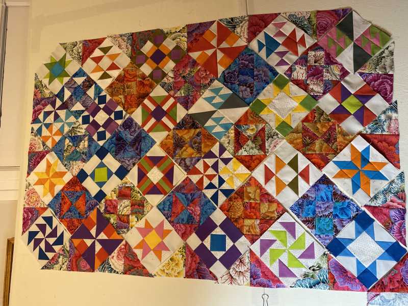 Sorry my design wall isn’t tall enough to take the full quilt so it’s draped across the desk.