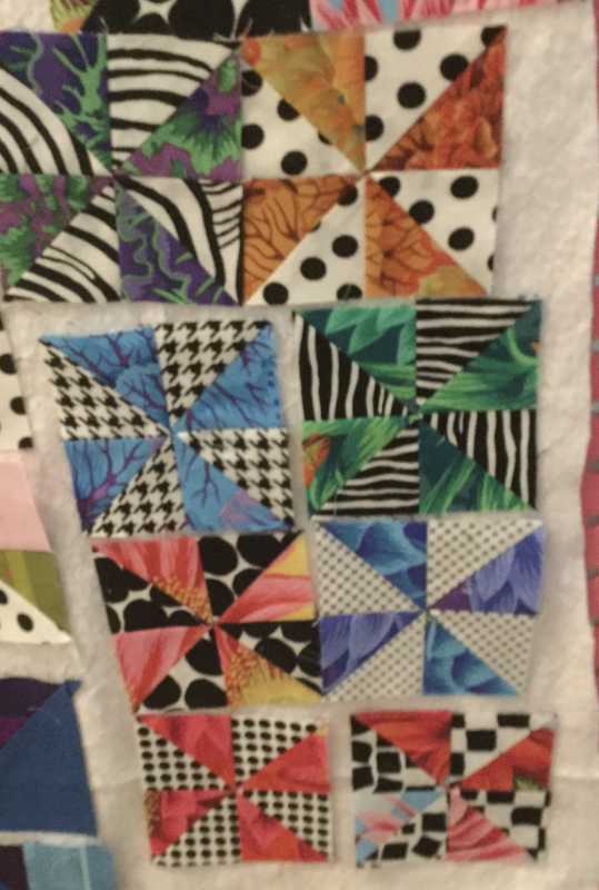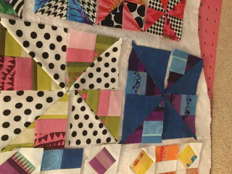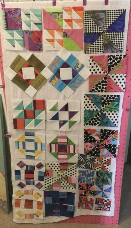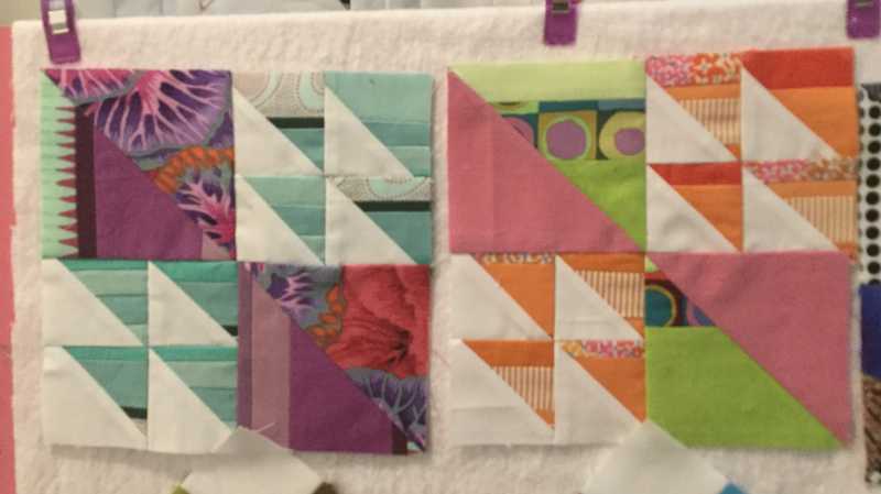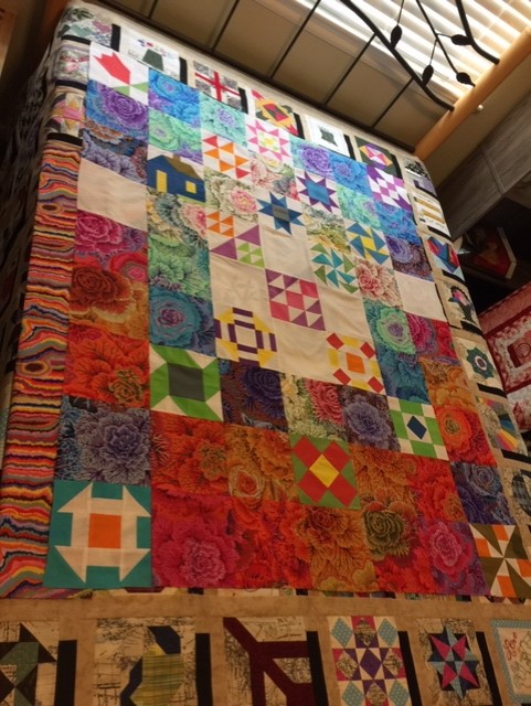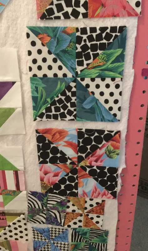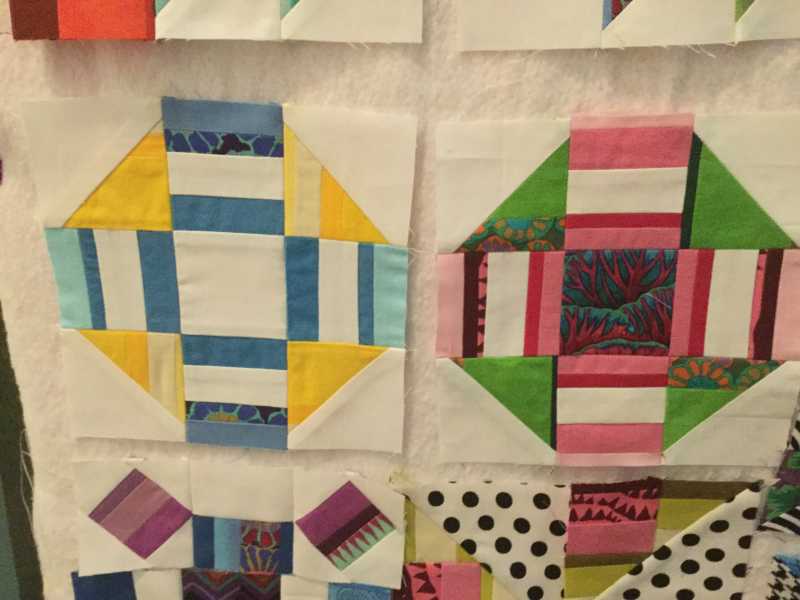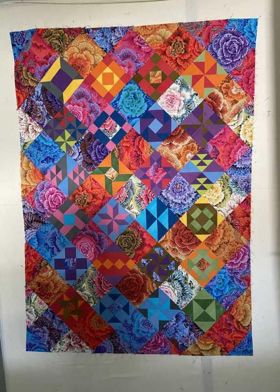 This was a challenge for me in that most of my quilts are derived from a pattern that I often tweak. That said, I rather enjoyed using a design wall and found that taking multiple photos with my phone helped me determine what block to place where. Some of the pieced blocks are intended to bridge the various colors contained in the Kaffe prints - for example using the 4-pinwheel patches to help the eye move from block to block and color to color. I also tried to graduate from bright, lighter values at the top to the darker values at the bottom of the quilt and I wanted the blocks to float against the background fabrics. Sorry the photo is crooked, but the real quilt looks good and I'm looking forward to having it quilted as well as participating in the next challenge from Alex.