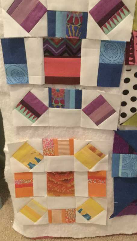 I fussy cut 8.5 inch squares out of the Kaffe fabrics to go with my pieced blocks. I am using the QAYG (quilt-as-you-go) method to put this all together (no on-point for this beginner) after I embellish the Kaffe squares, meaning I'll have a narrow border in between. I was thinking of using the leftover solid colors for the sashings. I don't have a design wall, but this is on a bed. Hubby is down with a back injury so I don't know when I'll get back to it to finish it. But here is my layout so far (imagine sashing strips).