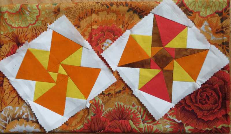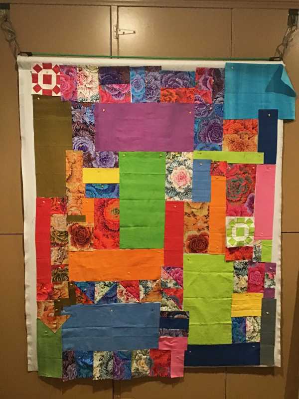 Designing from scratch was new for me so I appreciated Alex’s guidance in selecting and making the pieced blocks. I enjoyed using the Kaffe fabric as a basis for picking the fabrics for the pieced blocks using the color wheel. I’ve never used a color wheel before, but I’m sure I will again. One of my rules was to use some white in each block. I found that I wanted to put it in less predominant places the more blocks I made.