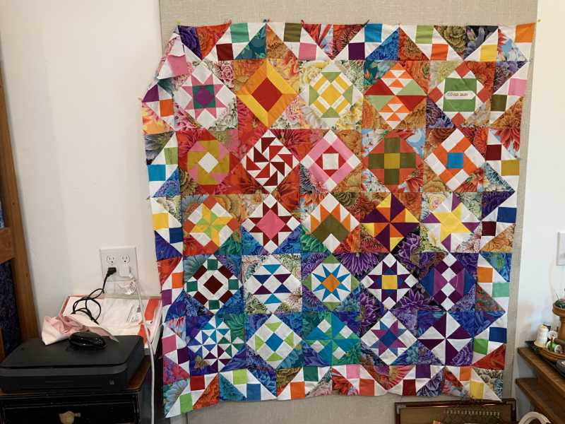 Here is the top of my Kaffe Mystery quilt . Love the colors and am happy with the border that I made for it. Lots of color which I love!. This was my first time doing these types of blocks so I learned a lot. Loved working with the color wheel and will use it again as I piece together the leftover fabrics for my backing. What a great discovery to use the glue stick sometimes! Thank you Alex for an enjoyable experience.