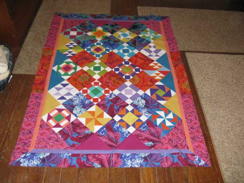 My accountant’s brain kicked in when I was finishing so you’ll notice symmetry in the placement of the “solid” Kaffe blocks, the setting triangles and the borders. I needed a solid border to stop my eye so I used orange and purple 1-inch finished strips. I think black would have looked nice too. I ran out of the pink border fabric so I pieced some of the orange in the middle to match the blocks in the middle. I also used the “half-square triangle in the corner to make it look like a mitered border” trick, and I think it worked because of the solid fabric and the busy-ness of the printed fabrics. If I were to do this again, I’d piece the Kaffe six-inch blocks using a quarter square triangle block, but the fabric is so busy it’s ok.