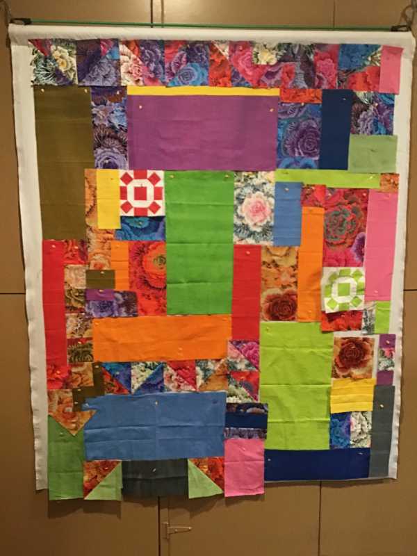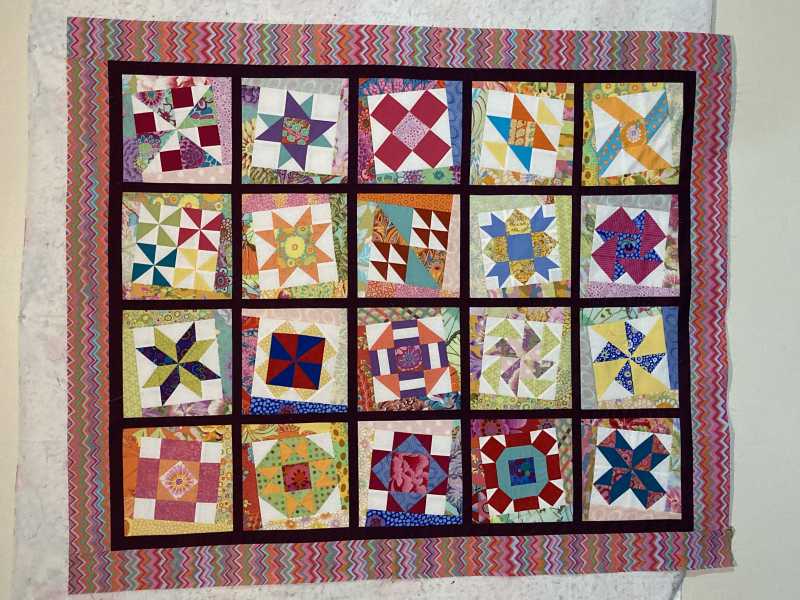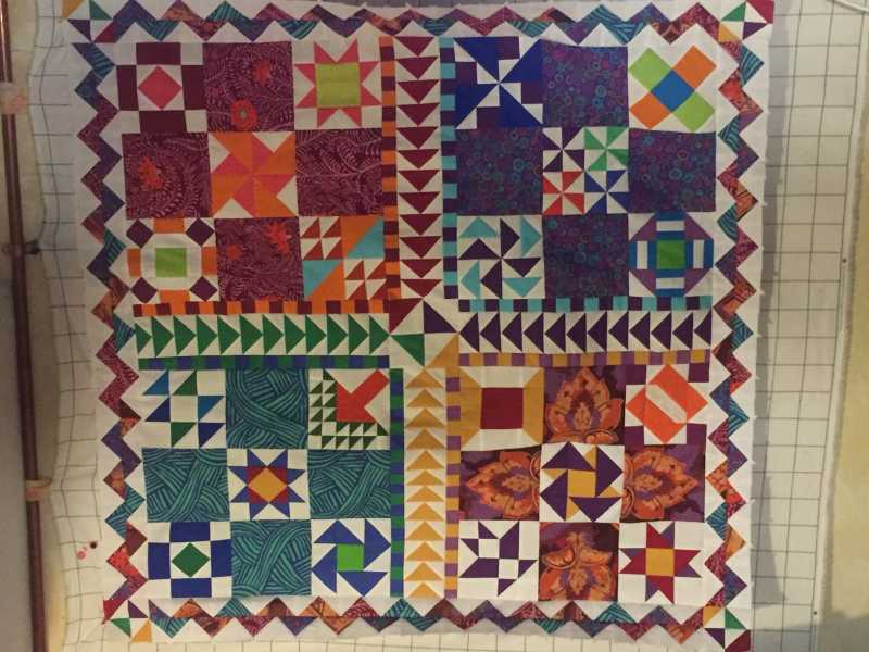 I have had so much fun with this project. I started a little late and since I have plenty of Kaffe Fassett fabrics, I decided to use what I had and mix in solids and other fabrics that read as solids. Many, many of my fabrics came from my Kaffe scrap basket. Since I didn’t have a lot of large pieces, I had to come up with a layout that featured our blocks and still used a wide variety of fabrics. I gave the blocks a wonky twist. The blocks are sashed with an eggplant colored fabric (it is not black).
