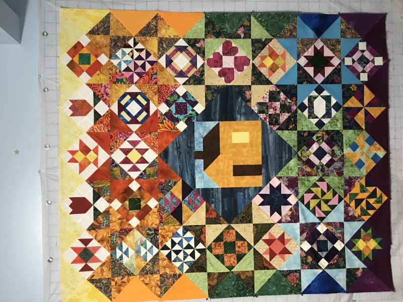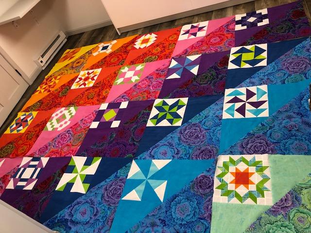 My quilt is a bit hard to photograph as it is sooo big. It will finish about 98 x 120. To see it all together I had to use the floor of our guest bedroom.