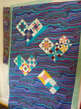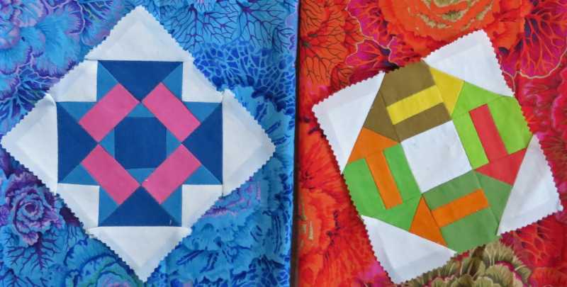 Finally had the time to share what I have been working on... LIFE has intervened! Mine is from two vintage Kaffe fabrics and a selection of solids that play well with both. The color story is much softer than the Kaffes most are using, so as I was working on it a plan developed to make it for a young child. I remembered a heart shape made out of three squares, so I decided to set my blocks that way. They will be outlined with a teal dyed solid, then set in the first Kaffe fabric which I hope I have enough of. The second Kaffe, a paisley, will be the outside border after an inner border of light green. That is the plan at this point. I only have the signature block to make yet. Thanks Alex, this has been fun!