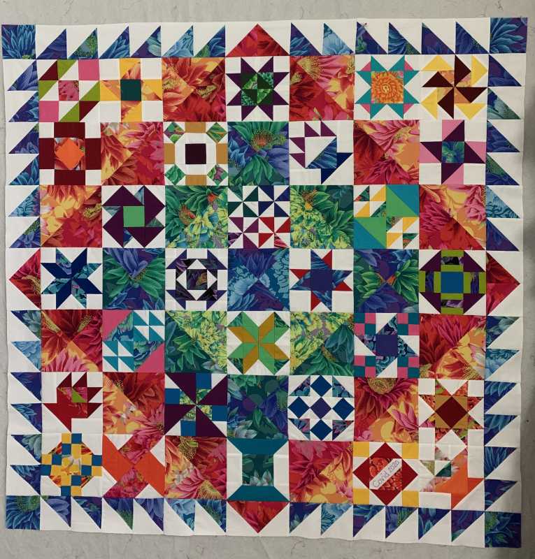 I am just starting the blocks for the Mystery quilt because it has taken a while to get my material through the mail. So while I waited, I practiced the blocks and completed the Sequoya Sampler with some of my Kaffe stash from charm packs. I chose a tropical theme since we are in Florida.