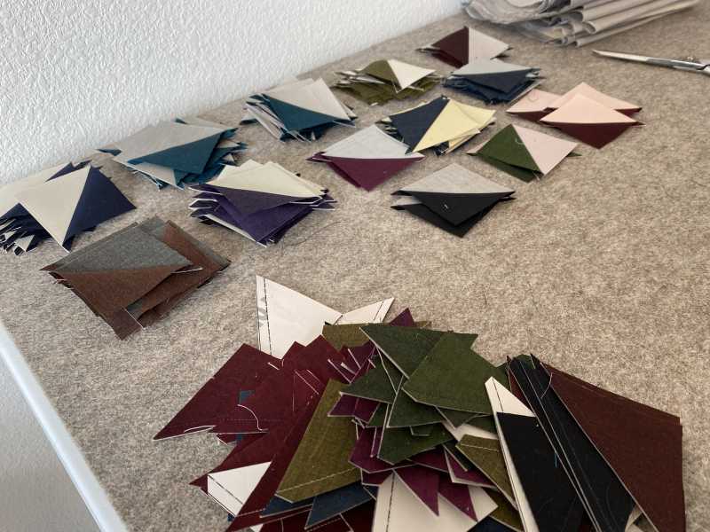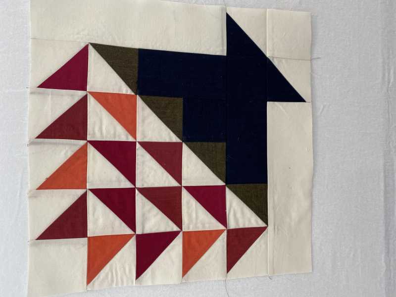 Here is my basket Puzzle quilt, all finished except for blocking. Because it is asymmetrical, I tried to use color to balance it out. The piece is 26”x26” and because it is small, I skipped a border and added a scrappy pieced binding. Quilting is machine stitch-in-the-ditch around the blocks and big stitch hand quilting inside the blocks. This will be my used on my dining table in November. Thanks Alex for the great lessons! I think this quilt incorporates them all, especially not pressing bias edges (or, what I think of as staying away from the “hot lava”