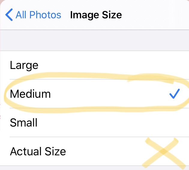 Then select a smaller size . I’ve been selecting “Medium” and the photos have loaded fine.