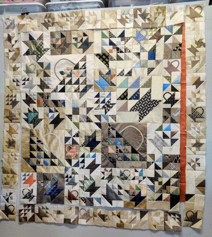 I think I am ready to sew the border on. the orange inner border will go all the way around. I am playing around with yoyo's and buttons on the baskets with handles. Not sure about this. I think I am happy with the quilt and wish it photographed better. It is all made with duponi silk and vintage silk ties. Ideas are welcome!