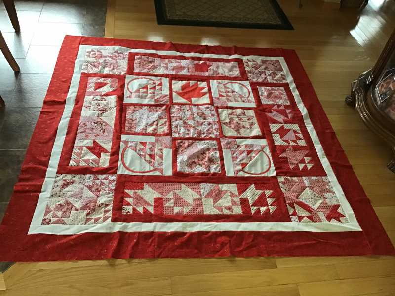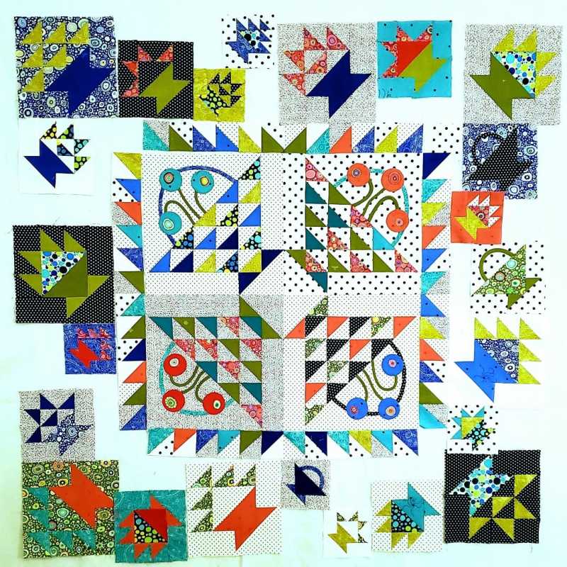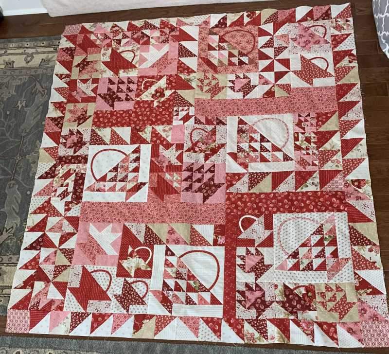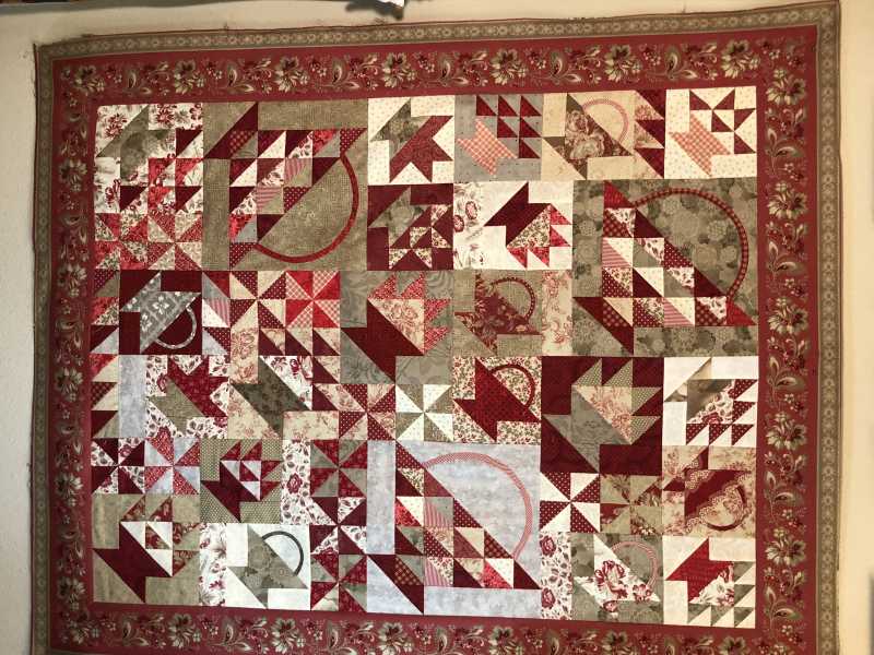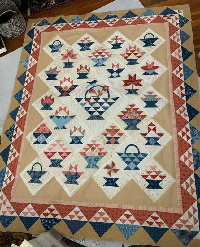 Thanks Alex. I knew when I started that I wanted my baskets to point up. After making my blocks (4x4’s and 5x5’s and a few 6x6’s), I couldn’t figure the math to do the background edges. So I sashed the smaller blocks (4x4’s) so that they were the same size as the 5x5 blocks. I tried colored or pieced sashing, but I wanted my blocks to shine. I used one of the larger 6x6 blocks (12”) for the center. The border is a bunch of 3x3 baskets. In the 2 yrs of quilting, I’ve never made a quilt without a pattern or without a vision of what it was going to look like so this organized result was a puzzle to me. Lots of that 1.414 stuff and lots of wrongly attached triangles along the way. My next step is to calculate the floater border and get the borders attached before tonight when I’ll need my design wall (bed) back.