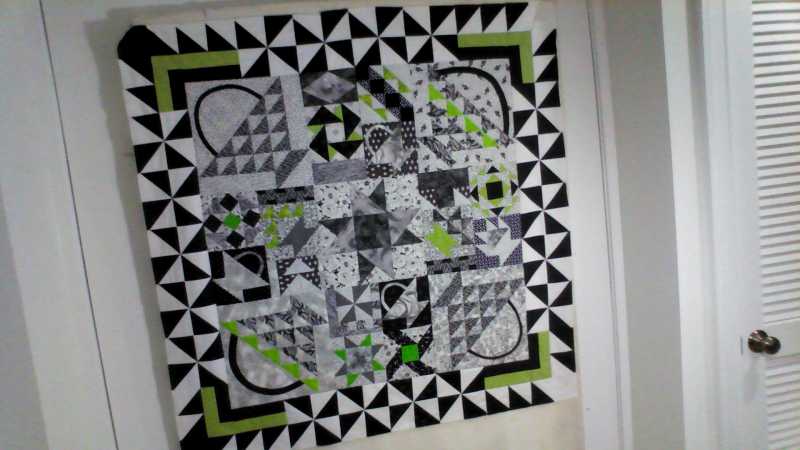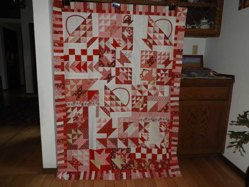Finally, my combination basket/mystery top is finished! When you saw my first post you weren't sure where I was headed with the partial black strips in the corners; this was my vision. The biggest thing I learned in this project is that busy quilts aren't my favorite style AND my math skills haven't improved much since school. I figured my border had to be "in your face" to distract from the business of the center. I have blocks left over, so now to figure out how to use them.
