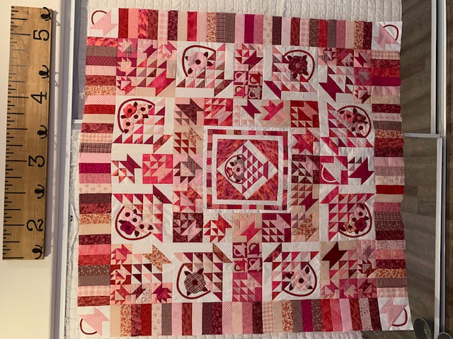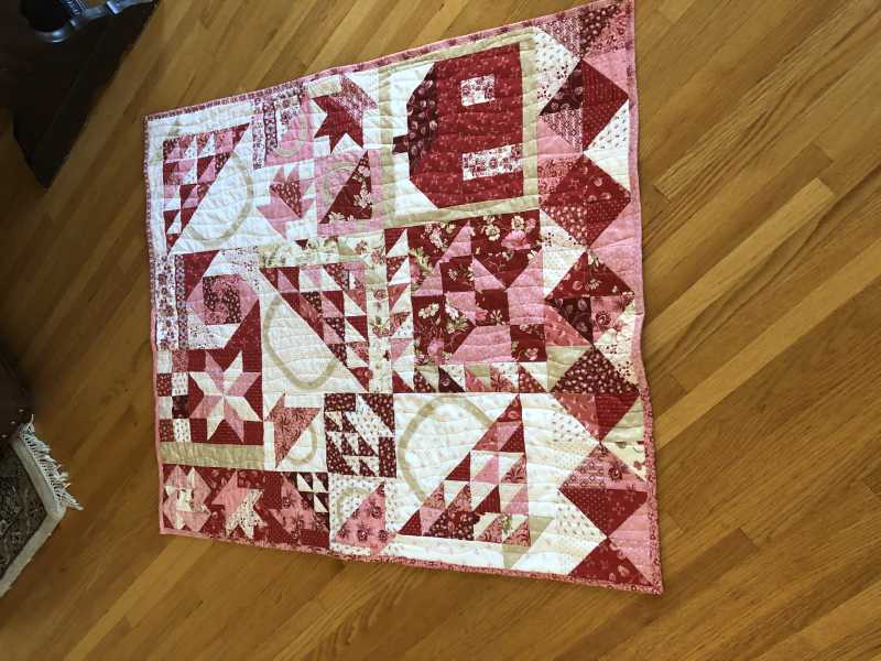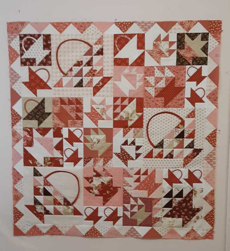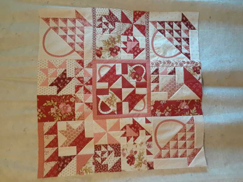 My Basket Puzzle finished quilt top...."What Are The Chances" A long, long time ago a lovely lady sent me a very special signed pink basket block as a thank you for something I had given her. I always planned to include it in a quilt one day but the perfect project never came to be...the block however over the years was always close by. I am now 75 and retired and guess who popped up on my computer recently with the perfect project? That same still lovely lady. What are the chances!!