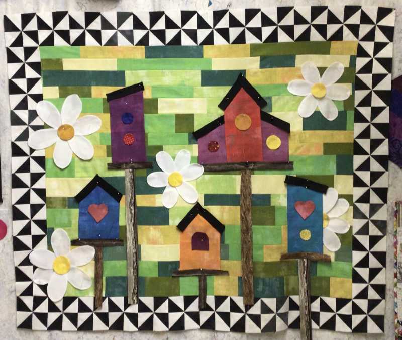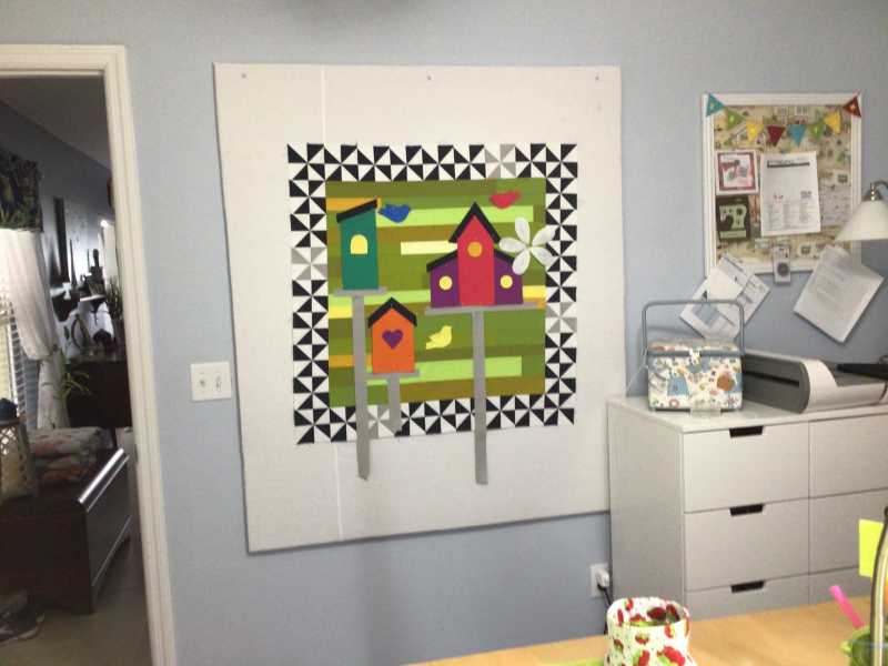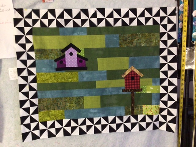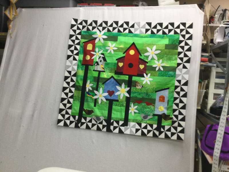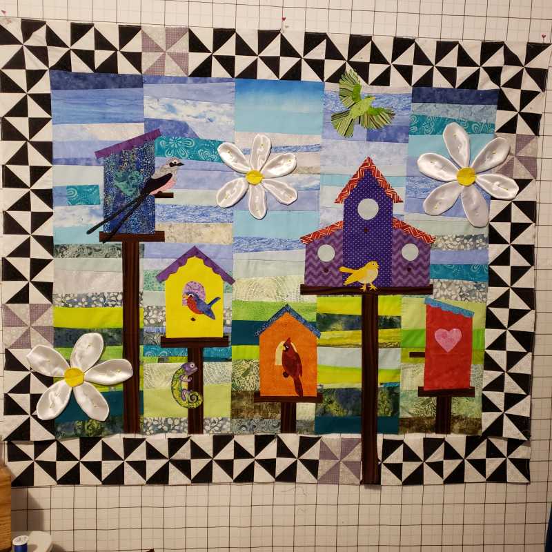 I added so birds, and bases for the birdhouses along with poles. Some of the stuff I added was from a McKenna Ryan quilt that I did, also I got an Accuquilt Go for Christmas that had a die for birds and Flowers that I used. I’m thinking of adding some leaves and stems for the flowers. While they will probably not show that much, I think it needs them. I also am looking at the blue birdhouse and I think it might need another door or window hole. I still need to run the poles through the border too. My circle centers to the flowers show through, so I will either add another layer of center or embroider on them.
