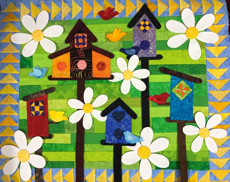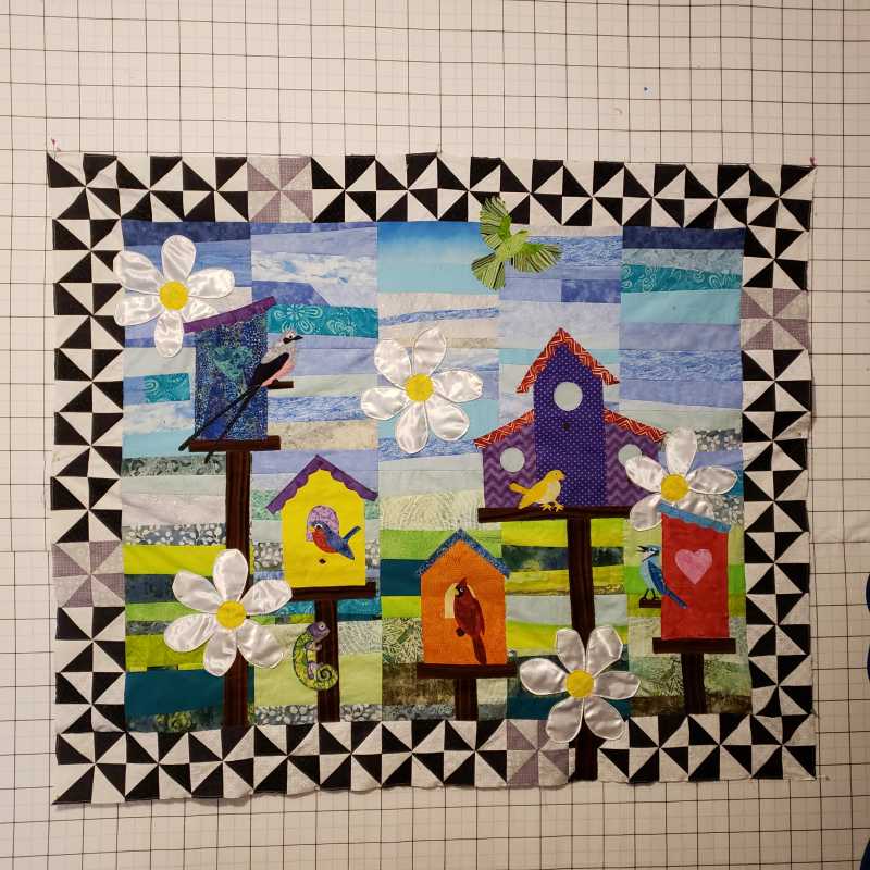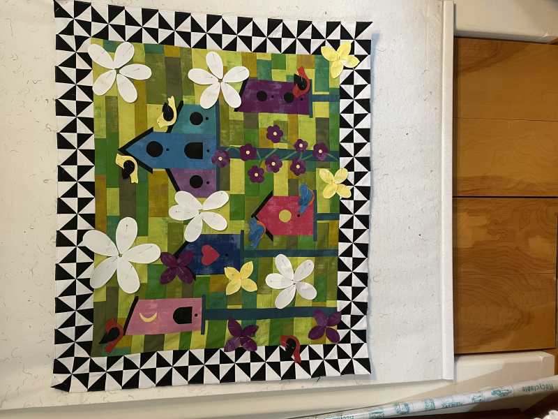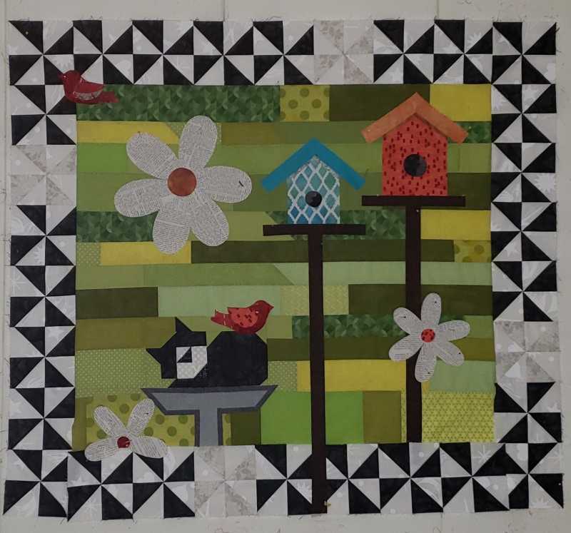 Love the cat - so cleverOriginally posted by "txquilter12" post=154308Enjoying the process of assembling and making the elements for the quilt. I decided to make the quilt about half the size. Currently, auditioning placement of birdhouse, flowers and birds. The cat is pieced into the background and the bird feeder is applique. Not certain if I like the birdfeeder - may need to add other design elements to make it more cohesive.