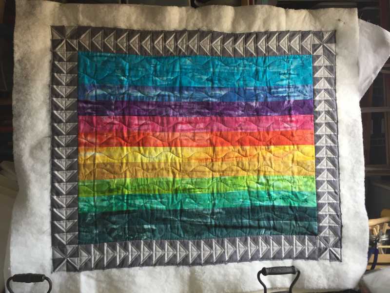 I decided to machine quilt my background and border first, before adding appliqué pieces. Assembled sections of birdhouses , birds, flowers, raw edge, machine blanket stitch. Now everything in position to be stitched down, may use some other decorative stitches. Green with white polka dot for binding!