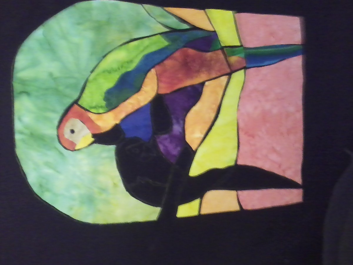 I'm getting close to done adding the batiks with fusible. Then I need to make a lot of very thin black bias strips. I also need to sew black lines to show the feathers and details before adding the bias. I was using Suzanne Marshall's method of making bias. It is great but some of my bias is slightly bigger than 1/4" and it would be nice if I could do 1/8" for the stained glass effect. The drawing has areas where it's 1/4" and areas where it's smaller. Since I made the pattern from the drawing, tracing it on a light box, I need to try to vary it. The easiest part was fusing of course. This method I'm using is from a class by Esterita Austin who shows it on an early episode here. I used the transdoodle chalk paper to trace the pattern on black cloth so I'd know where to fuse the pieces.