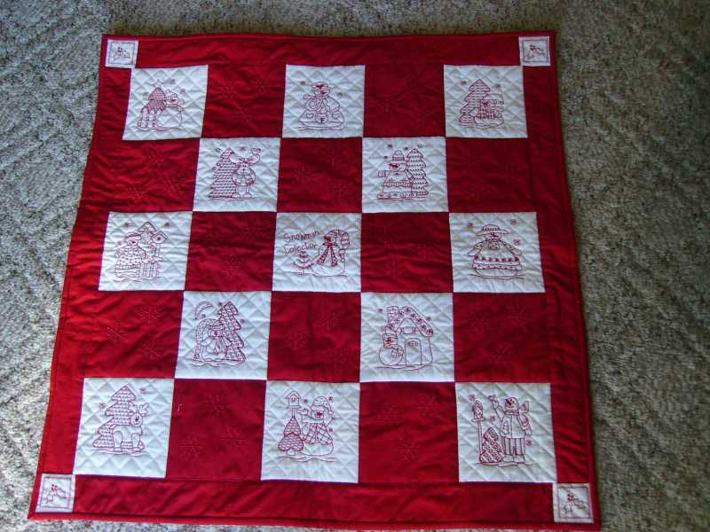 Thank you everyone for your kind comments! Charae, the pattern is by Lynda Howell of The Stitch Connection, pattern #207 Snowman Collector Machine Embroidery. The pattern includes both 27" and 48" square wall hanging patterns , and a large Snowman Collector pillow pattern. Website is: http://www.stitchconnection.com/embroidery.html. Both were so much fun to do.