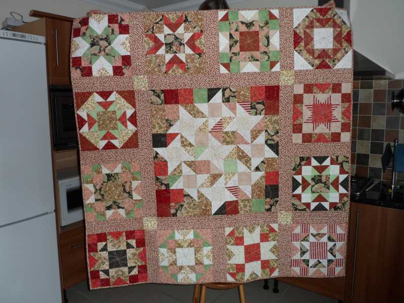 I have FMQ it myself on my Bernina 730 and it is really just a sampler quilt because I just played around with available fabrics, most of which were leftovers from other projects, in the stars and the centre was pieced using a doodled design I did during a meeting. The only fabric that had never been touched before was the one with the fans. The FMQ is also just designs I have been drawing on paper and felt I wanted to try. All the blocks around the centre are quilted with different designs and they are all repeated in the centre "block". This is the first quilt I have ever made where I have felt it all is coming together for me - colours, piecing and quilting.