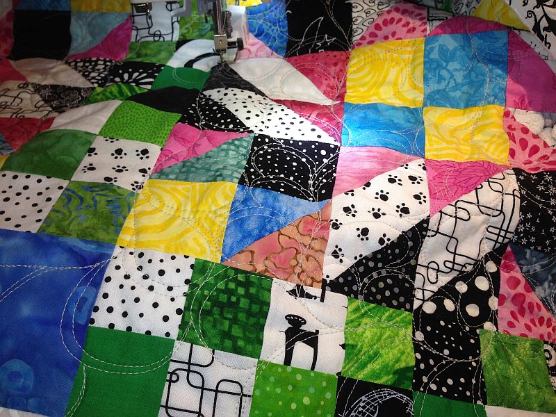 I love the colors and geometric design of your quilt, Geneva. From what I can tell, the quilting is straight line and sometimes decorative stitch on a diagonal? Would you tell us what you did there?