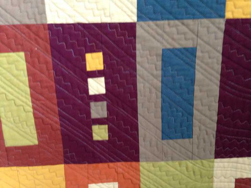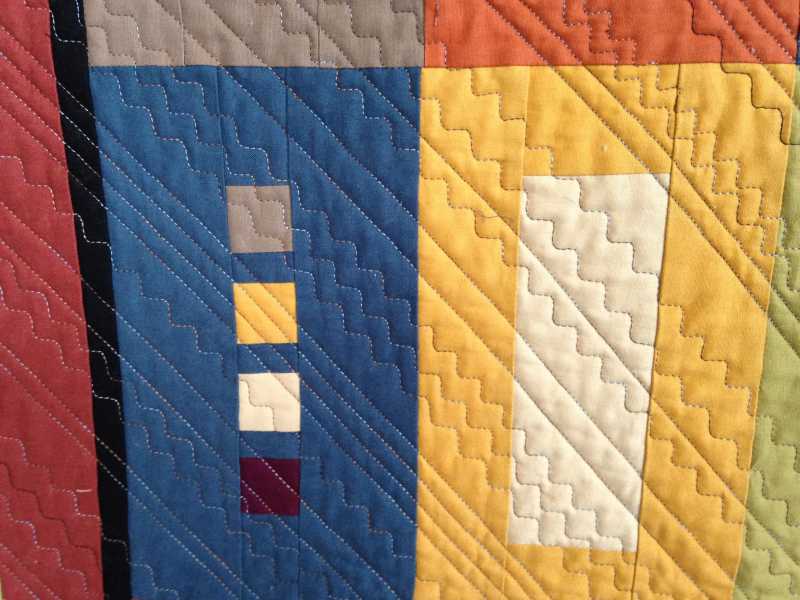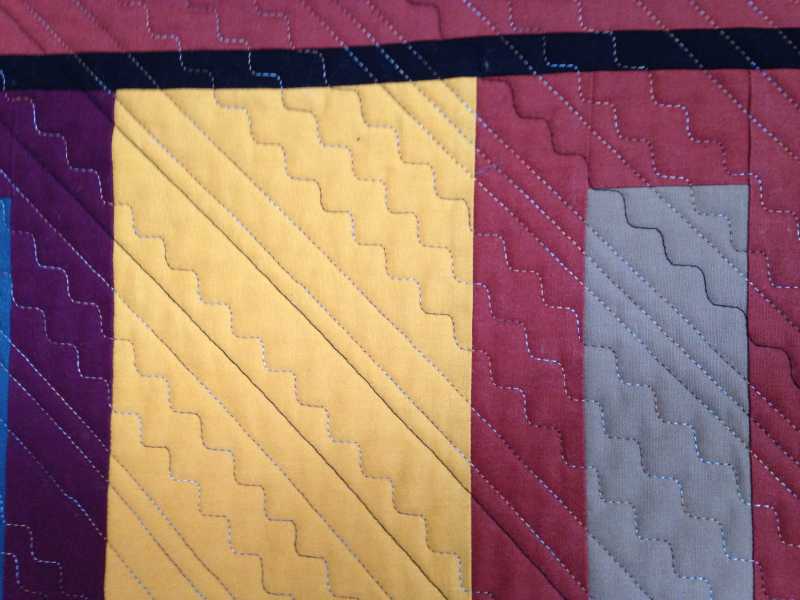 I quilted on the diagonal to bring movement to the rectangles. I used a straight stitch and a wave stitch. I used an entire 500 yard spool of Superior variegated thread. After that quilting I went back and added some quilting in black. About half way through the quilting I thought "Who's bright idea was this to quilt so close together?"