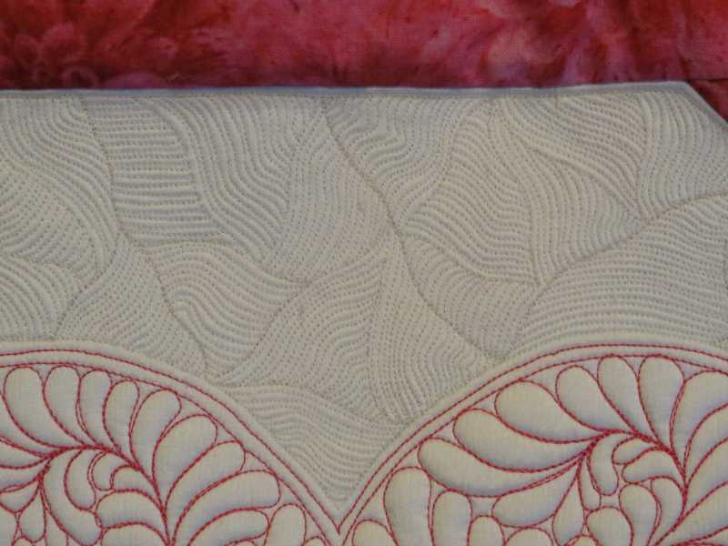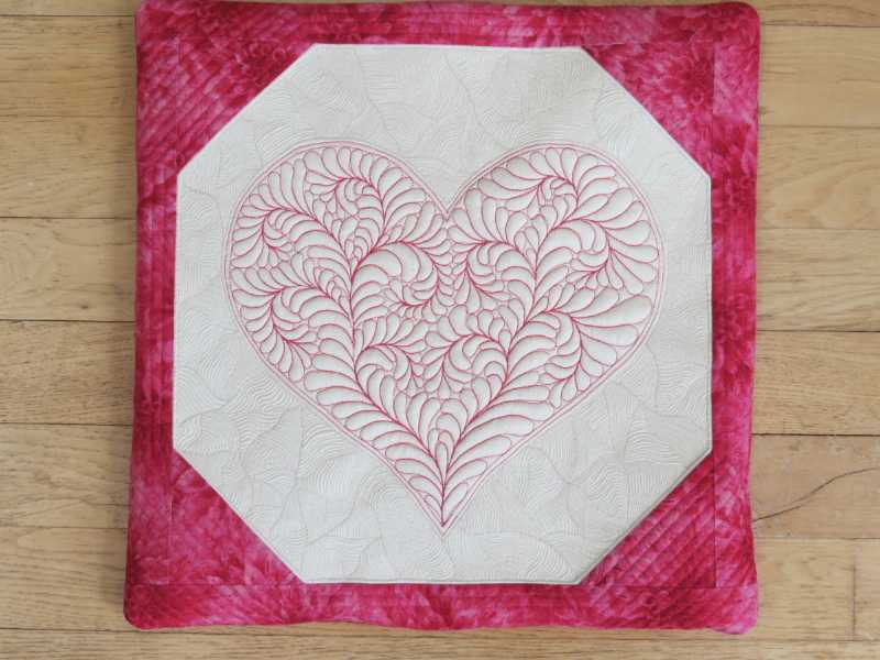 The heart is quilted on a piece of Dupioni silk using FilTec Glide thread. The background is quilted using Superior Kimono #100 silk thread. I really like the background design, which I just made up as I sat down: