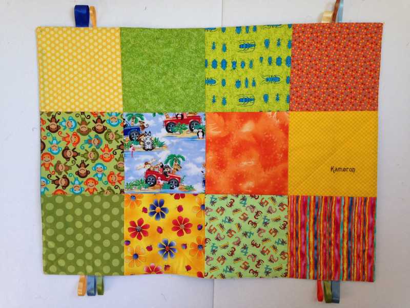 I've been working on the commission quilt. I made one already, realized it was too big and started over! Good grief! Both of them came out very nice, but I like the second one best. Now to quilt it. I had planned to start that today but my niece asked if I could make a snuggle quilt with taggies on it for her son. He will start going to day care and needs the taggies on quilt. I think if I said "no" I'd lose my quilting cred! Plus the older I get, the more mushy my heart gets. So I started this morning around 9am and finished at 2:30. It is 30" x 40". I used all stash including the backing. It's certainly not one of my art quilts, but it will keep the little guy warm and hopefully happy. I used all the shortcuts and didn't quilt it as much as I usually do. I even used some fabrics from his cousins quilts. I had it in the mail by 3pm and he will have it Monday.