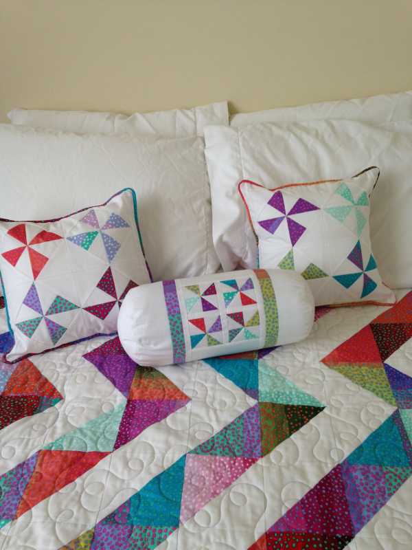 I think I showed you all this bed quilt I made last winter. It's for the back guest room. I used Kaffe Fassett fabrics and had it long arm quilted by my new BFF here in the tri cities. She did a great job. Anyway, I had some left over half square triangles so tried out the magic pin wheel pattern on Missouri Star. It was fun. I made 2 pillows out of those magic pin wheels. I made matching piping which was fun and tedious. When you make the magic pinwheels you end up with leftover smaller half square triangles. So I used some of them to make a neck roll pillow. I must thank TQS and Jacqueline de Jonge for teaching me how to sew a rectangle into a circle. It went very smoothly. I love how I learn something, then later I come up with another project and think "hey, that technique so and so taught me will work for this!" Alas, I still have a few small and big half square triangles left. Maybe a mug rug?