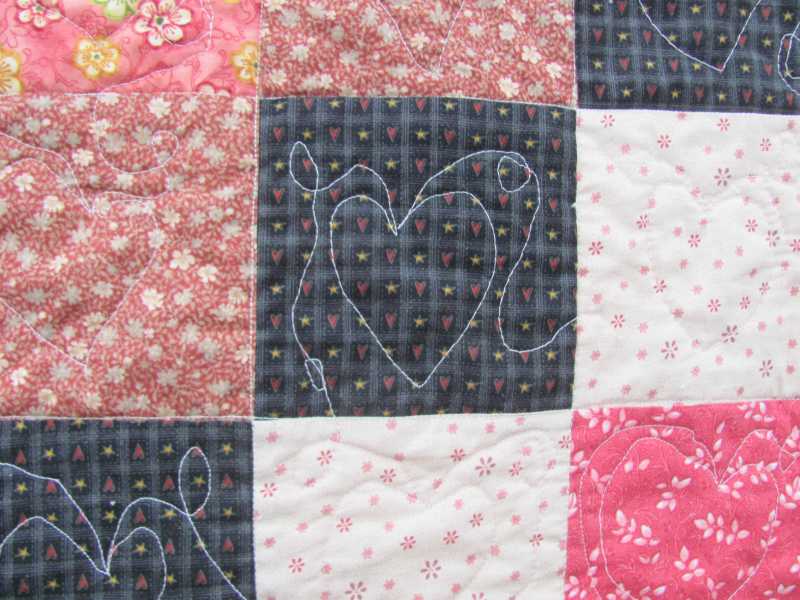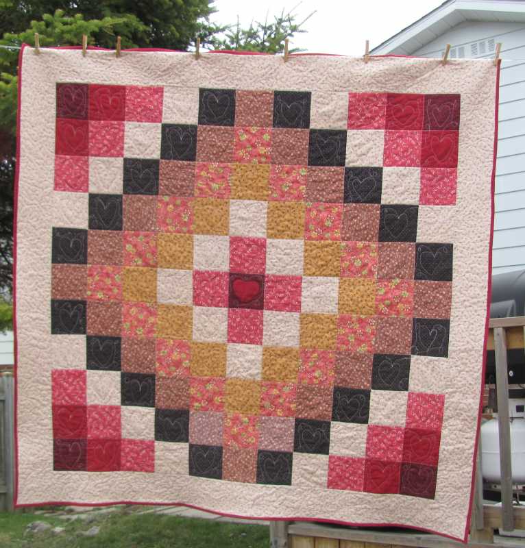 Finally got the binding on this UFO - I am no longer a FMQ virgin, as this is my FIRST big quit with FMQ on it. I was taking out the hearts because they were so wonky and crooked, and my DIL came along and said " Oh, how whimsical!" That did it for me and I finished! An other pair of eyes really helped!
