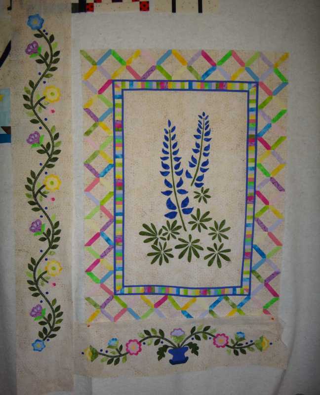 I have been really busy lately. I finished quilting one quilt last night, and put another on the frame. I need to get it quilted and both of them bound before May 7 for our guild quilt show. I also have to bind a wall hanging and two potholders for the show. Besides the quilting, I have been babysitting every day, and also taking my sister to receive IV antibiotics every day. A lot of running!! Her last day is tomorrow, then it will just be a weekly trip to the doctor.