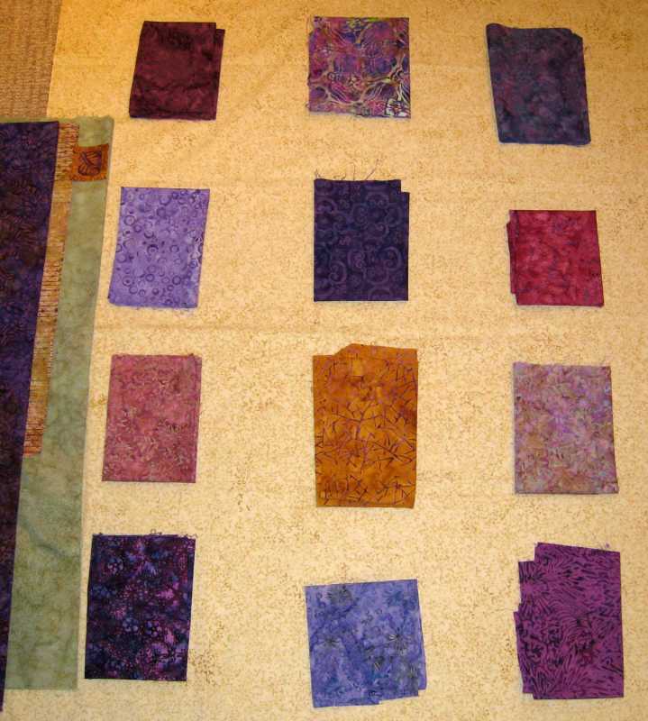 These are the 4 fabrics I removed from my house quilt for now: 1, 3, 6, 13. Of course that may change after I get the blocks made and the arrangement isn't guaranteed, but it's a start. The pieces are cut and ready to sew.