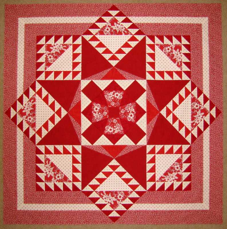 I persevered and finished the feathered star quilt top today. The outer border was quite a challenge. Actually the whole quilt was a challenge. I only used paper for the center block and the HST's. The rest of the pieces were large enough I decided not to paper piece so I could finish it faster. I'm not sure how much faster as it required some careful piecing, and the occasional use of a seam ripper during the final assembly. It finished at about 43" square. I'm thinking of having it quilted by check. I know, I have a longarm machine but I do mostly computer quilting on it as I've yet to take the time to learn free motion quilting and it would be very time consuming to do this one by computer.