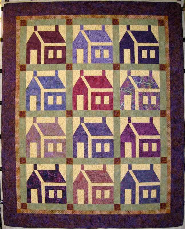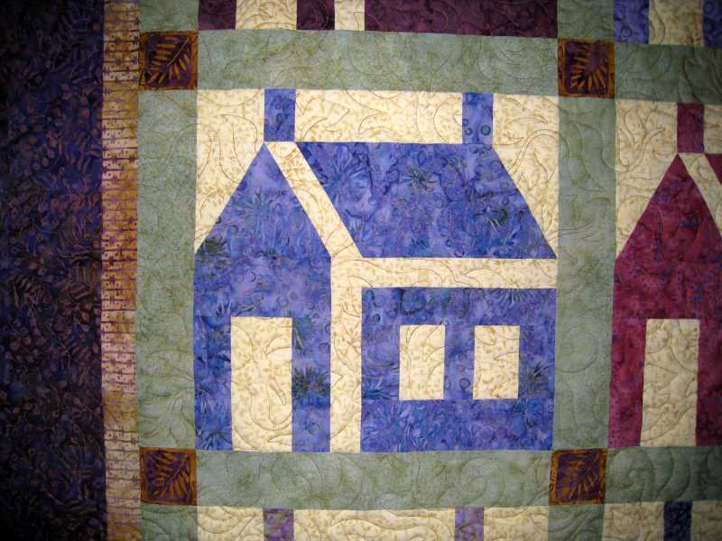 Rita, you asked for it and here it is. I still need to sew the binding to the back. My DH is supposed to bring some thread back from town. No label yet either, my pigma pens and labels are at my city home where I will be going tomorrow to get back to working on bookkeeping. Since I'm my own boss I can take days off whenever I choose. I found an E2E leaf pattern called Stormy in my quilting program. While the machine was quilting I was multi-tasking, running up and down the stairs from one end of the house to the other. Some day I would like to learn free motion quilting, but for now I'm mostly a piecer and the quilting gets done the fastest way possible. I'm not trying to win any contests and I'm usually happy with the results. The quilts that need more custom quilting are still waiting to be done.