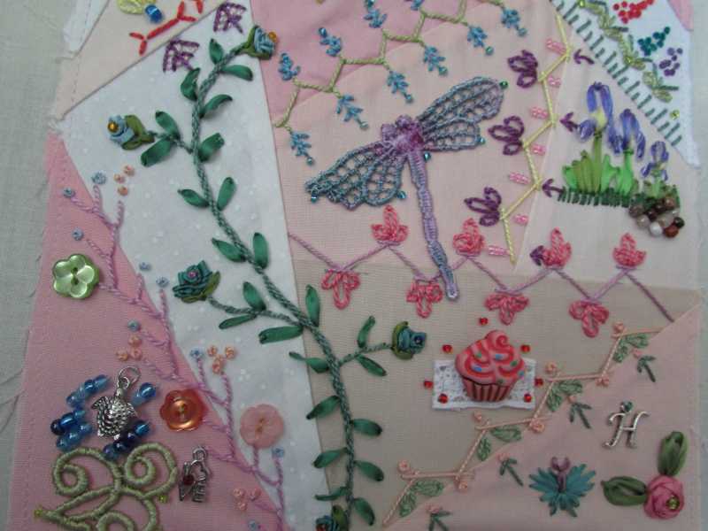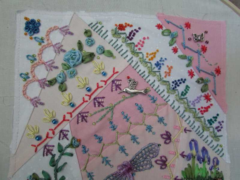 Thank you all for the wonderful compliments. The teachers name is Kathy Shaw. I originally met her yrs ago on the HGTV message board, when Alex was on Simply Quilts . This is the first time I have ever taken class with crazy quilting embroidery and ribbon work. I do find it very relaxing .