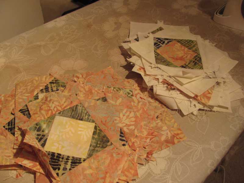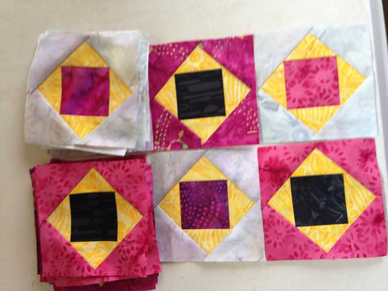 Since I have made 356 square within a square/economy blocks, (side note: I was going to exaggerate here but realized the truth is crazy enough!) I found that trimming the blocks after the first and second round of triangles makes everything come out better. I trimmed the first round to 3 3/8" square and the second round to 4 1/2" square. Be careful to take some off all 4 edges so your square is actually in the center! Or, just foundation piece them like Terrie suggested!