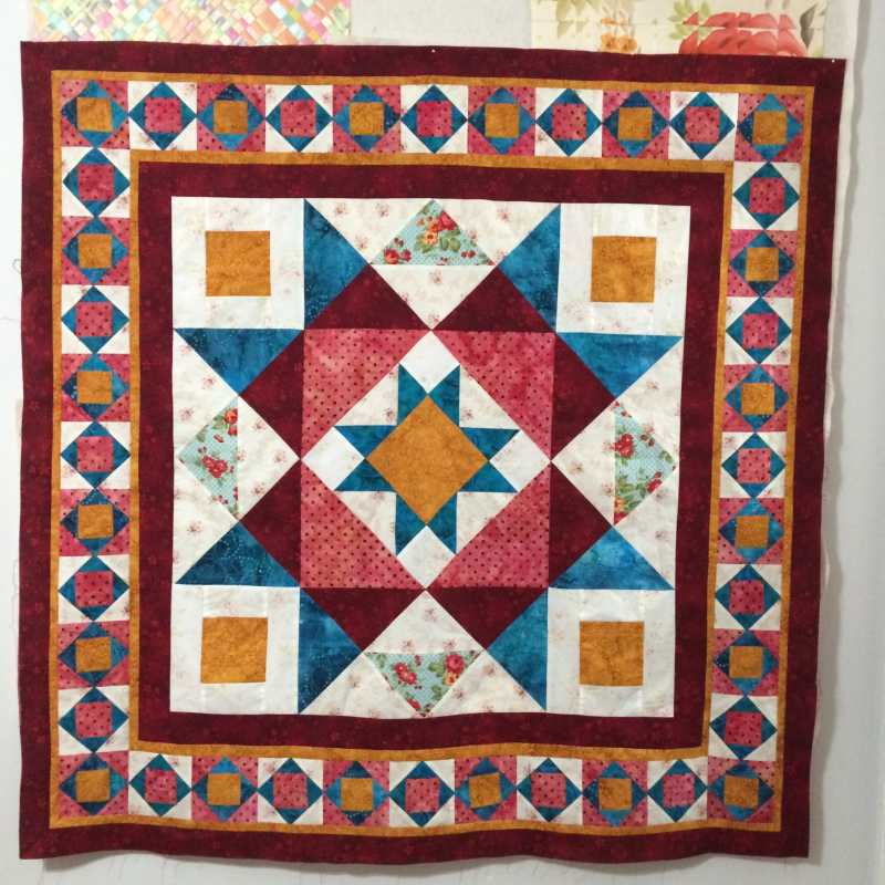 Ok, it's time for me to confess! I don't cut or sew as precisely as this mystery quilt should have been done. That being said, you will notice that my two borders that should have been one color are two colors. My square center wasn't square, and it was off by 1/4 to 1/2 inch. So once the red border was on I thought everything would be ok. But my row of 9 square in a square blocks was yet another inch larger than the smallest side of what was now the center. So I added the gold, only I couldn't add the same amount to all sides, as the rows with 11 blocks were just a bit further off! So I twiddle and tweaked my numbers til I figured I would at least get the rows of blocks to line up. This did work out nicely. Then, obviously the second border of red needed to be adjusted and I was concerned that if I didn't add the gold again it would look too much like a goof. So I pieced the strip extra long for each side, pinned from the middle out, only sewed to and from the 1/4 inch mark. I back stitched very carefully so I could make those mitered corners. I'm about an inch and a quarter larger than it should be, but I can trim it to work with whatever comes next. Or add to it if I goof up again. I do like how it's coming out.