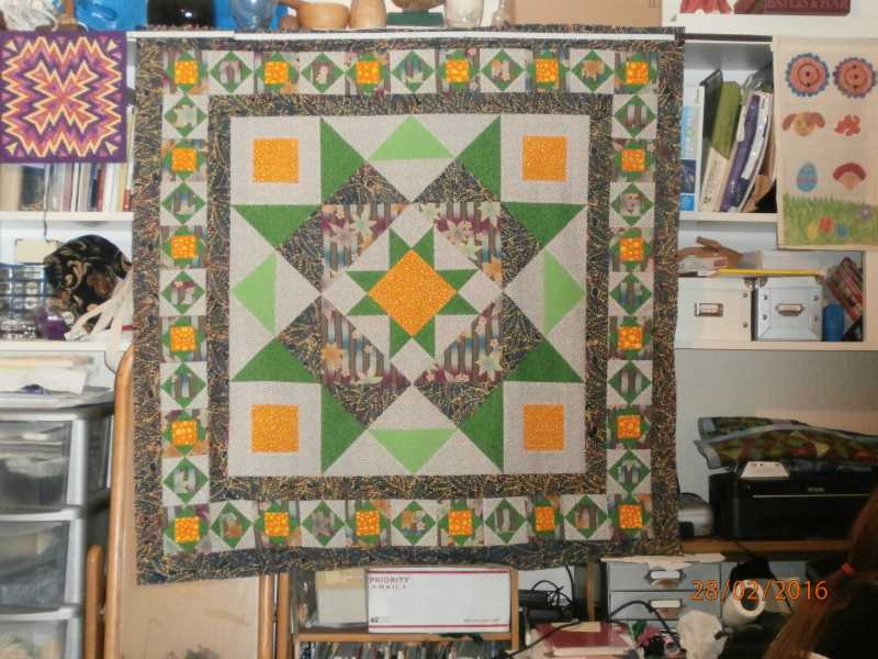 Well, here is mine up to date. Just made the February deadline. I'm not sure I'm going to add more to this. Well, maybe a border of a coordinating fabric. But I will wait to see what Terrie has in store for us. And I'd like to give Terrie a shout out for providing us with this mystery quilt. Thank you Terrie!