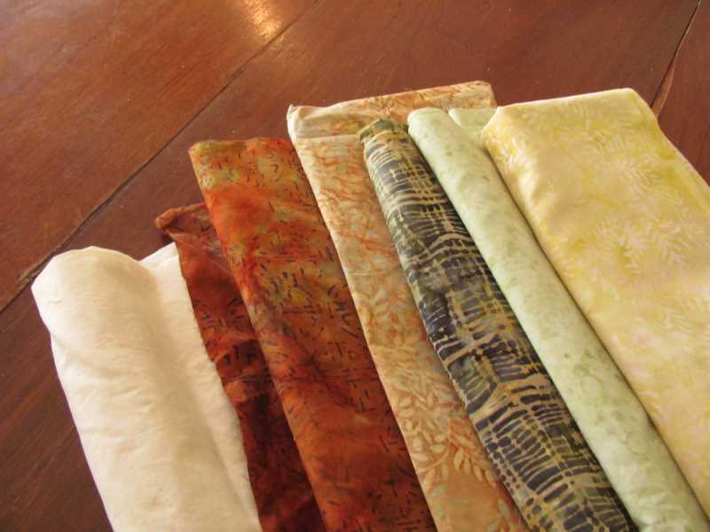 So, here's my fabric choices. 4 of the 6 came from my stash, but I originally had wanted to do blues and greens. Your background does not have to be so 'off-whit-ish'. Mine is a pale creamy/pinky/yellowy batik.I've seen it with an aqua background or otherwise.