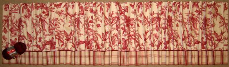 I finally got to couch some yarn to a practice valance I made for my real retreat center. I purchased it a few weeks ago on the day my DH interrupted me with something more urgent so didn't even take it out of the bag until now. It still needs a rod casing as soon as I decide what size rod I'm going to use. Now I just need to make 5 more. But first there are still more urgent things to do since I'm so far behind on everything.